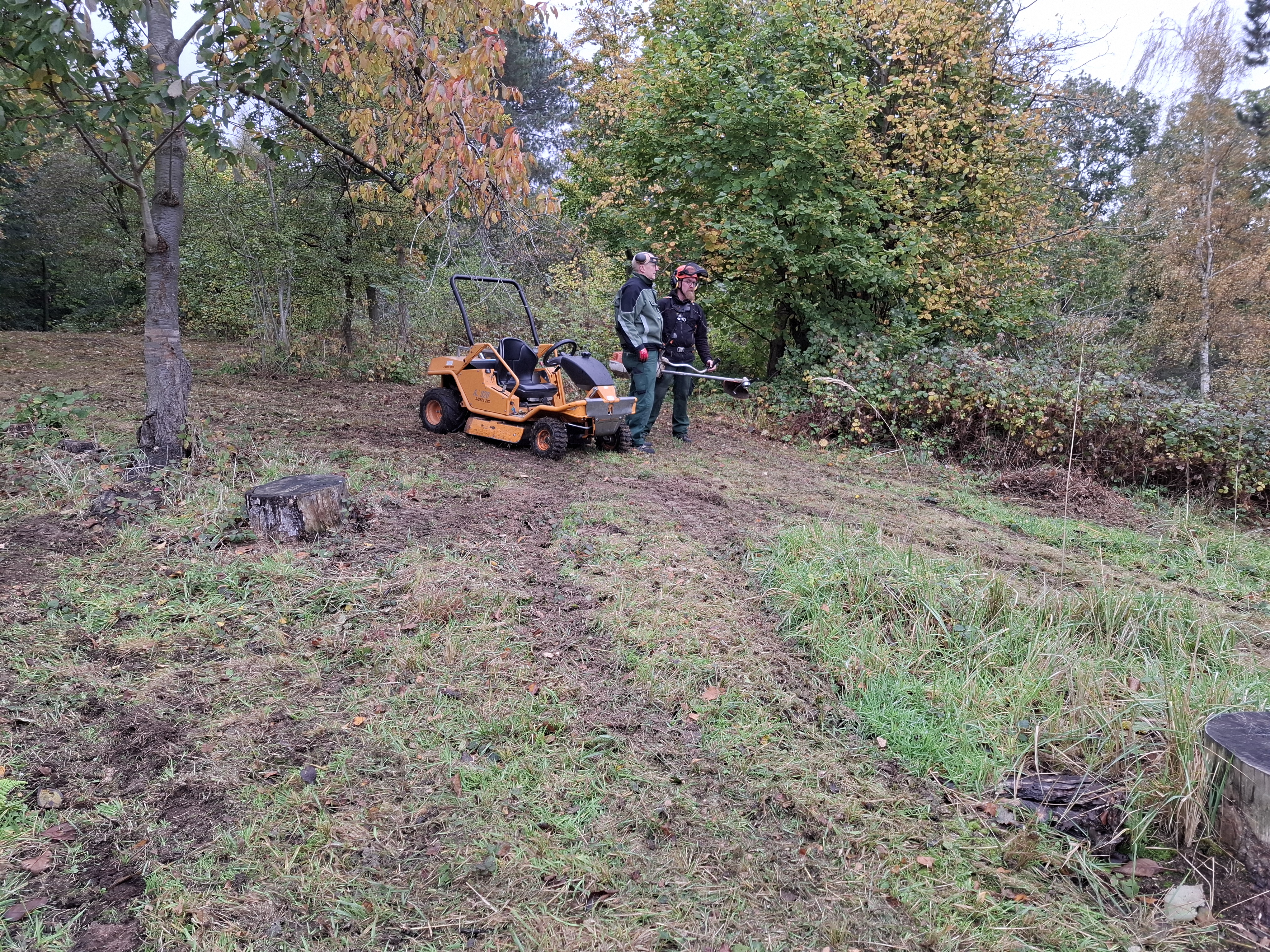 Lars og Vilhelm fra kommunen fik ført el-tråden i jorden under leddet i hegnet, så nu er der strøm på hele hegnet igen. Inden de gik hjem fik de slået bankens nederste del for brombær og langs hegnet, samt mellem træerne nederst på banken.